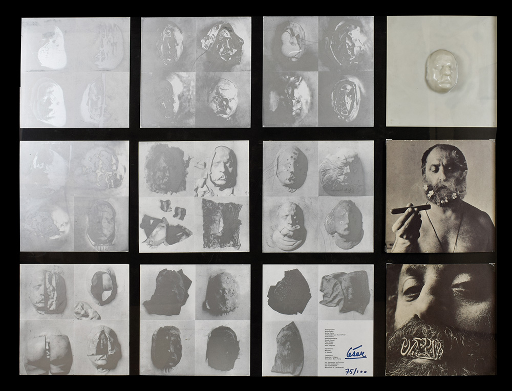 CESAR (Marsiglia 1921 - 1998), Tete a tetes, 1973 multiplo es. 75/100 contenente una maschera in plastica termoformata, 9 targhe suddivise ognuna con 4 autoritratti ai sali d'argento e una brochure con numerose foto su una prefazione di Pierre Restany, 83x110 (24x24 cad.) firma e tiratura in basso