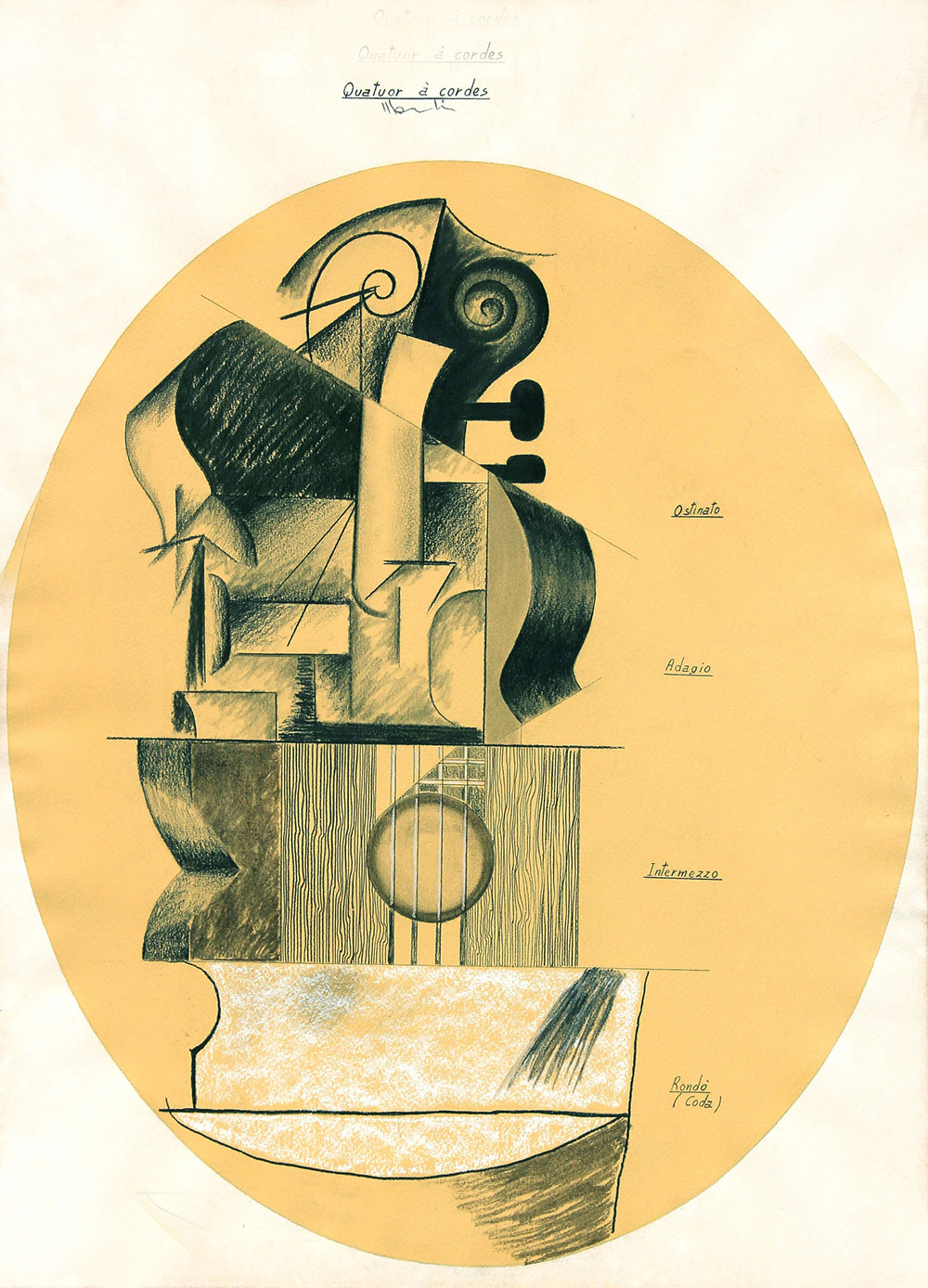 Aldo MONDINO (Torino 1938-10-04 Torino 2005-03-10) Quatuor a cordes 1976 tecnica mista su cartoncino cm. 75 x 55Brochures della galleria Cesarea, Genova, per la stagione genovese 1975/1976, vernissage 8 marzoFirma "Mondino" (in alto al centro) Etichetta e timbro della galleria Cesarea, Genova (al retro)