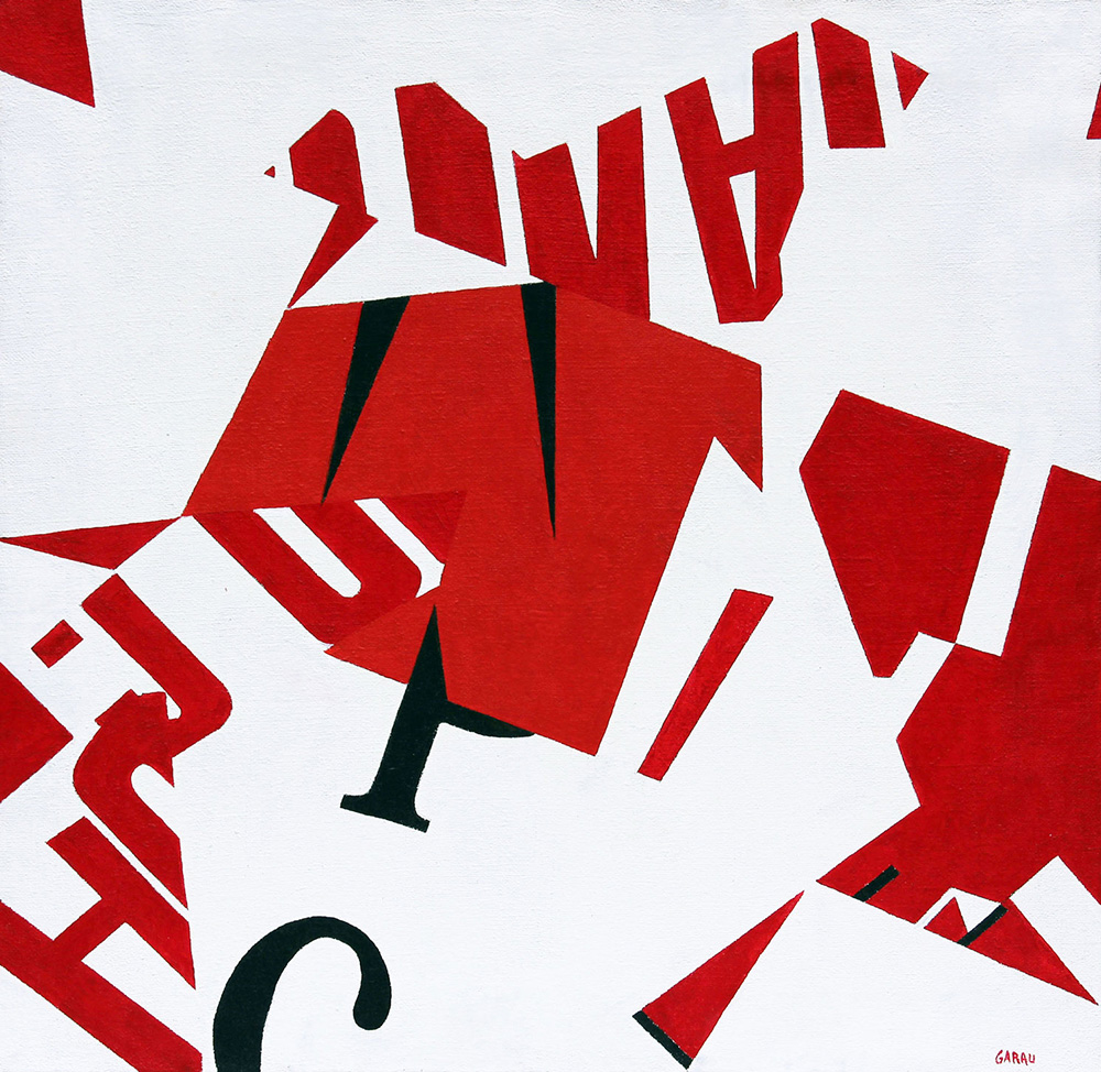 Augusto GARAU (Bolzano, 1923 Milano, 2010 ) Lettere tagliate 1973 acrilico su tela cm. 80 x 80Firma "Garau" (in basso a destra) Firma, data "A. Garau, 1973" (al retro) Autentica della figlia Marina Garau