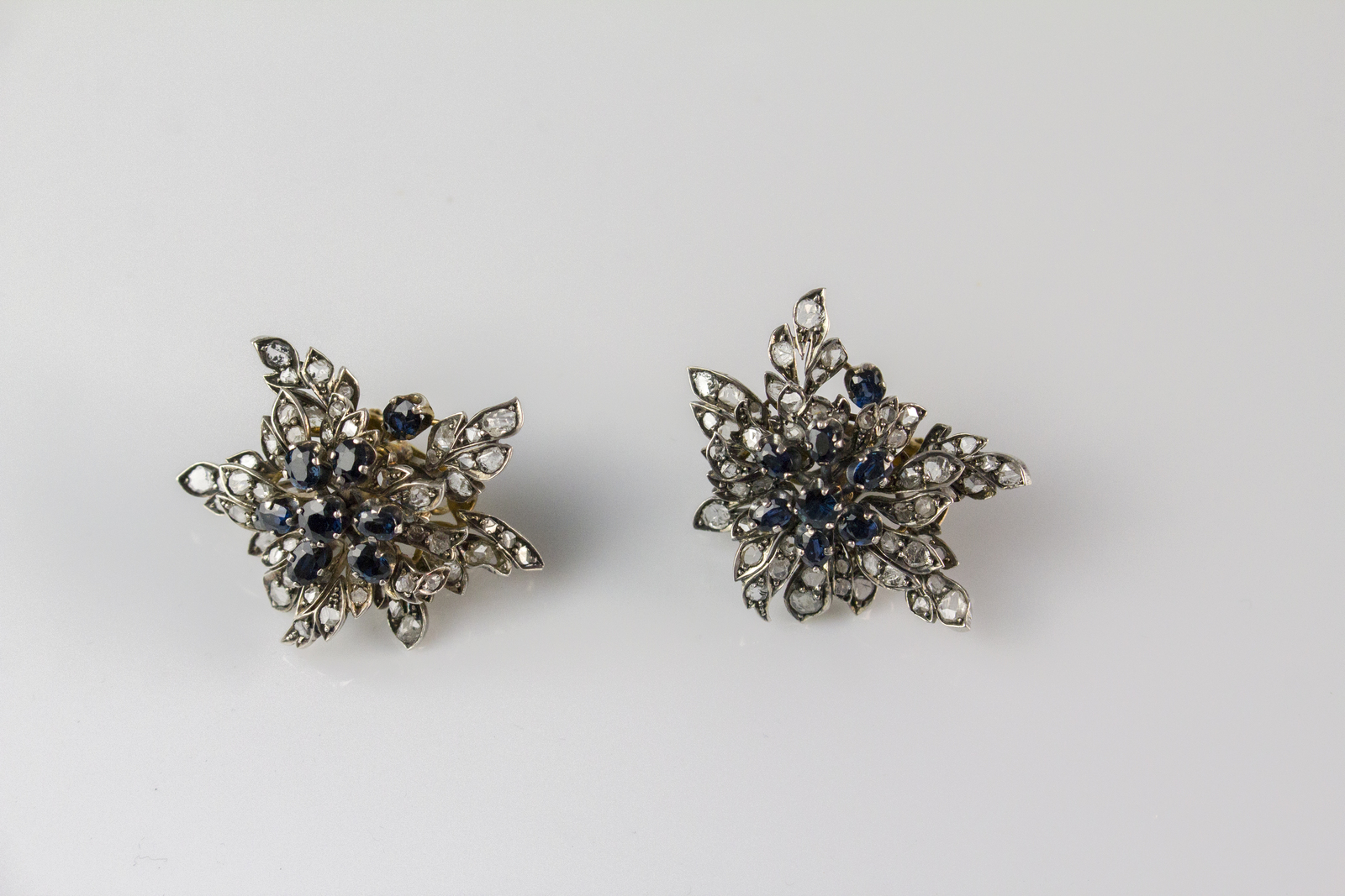 Orecchini fine 800 a fiore in oro, argento, zaffiri e diamanti rose cut. . .