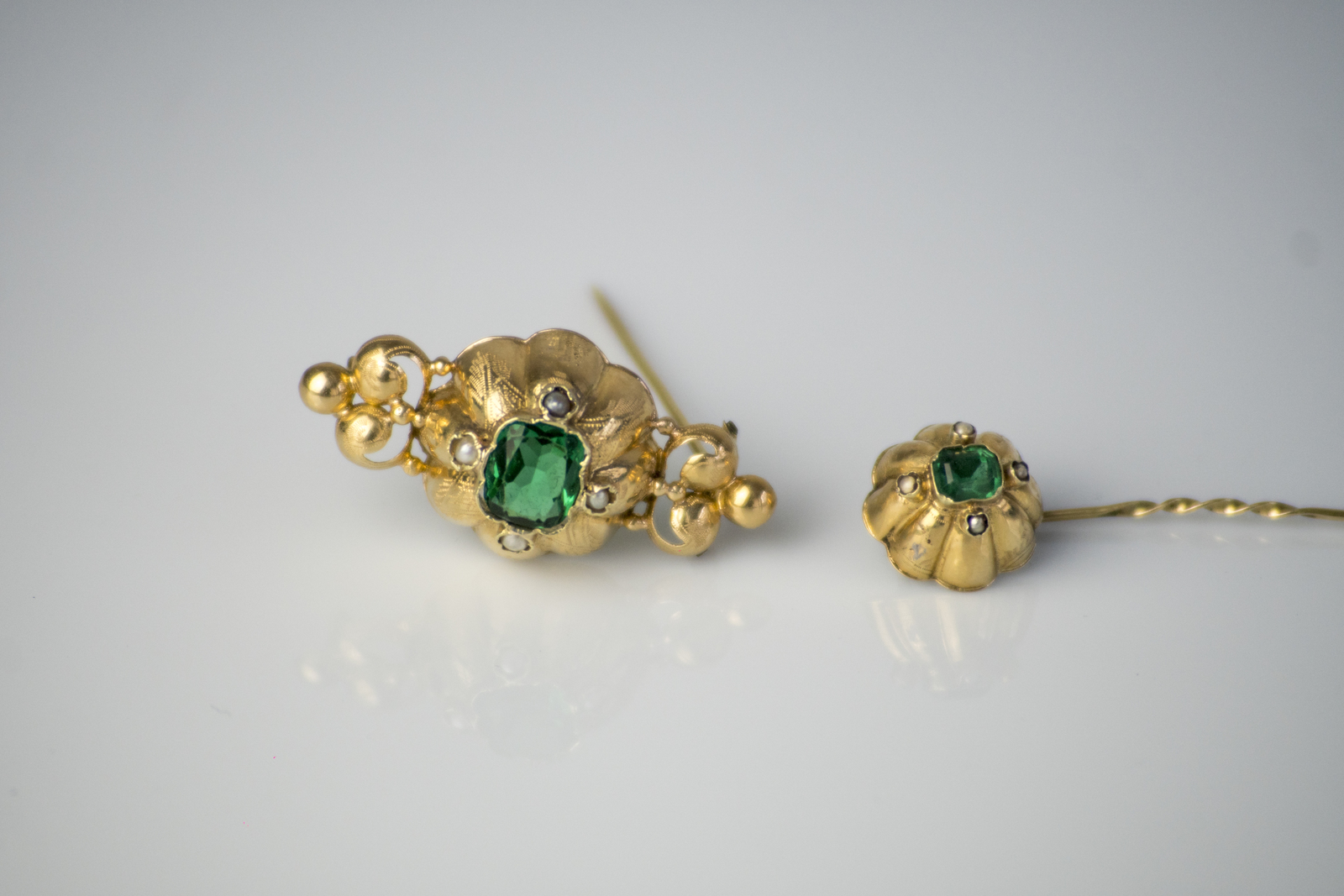 [Nessun Autore] Two 18kt yellow gold borboniche brooch with pearls and glass paste, total gr 6.33. . .