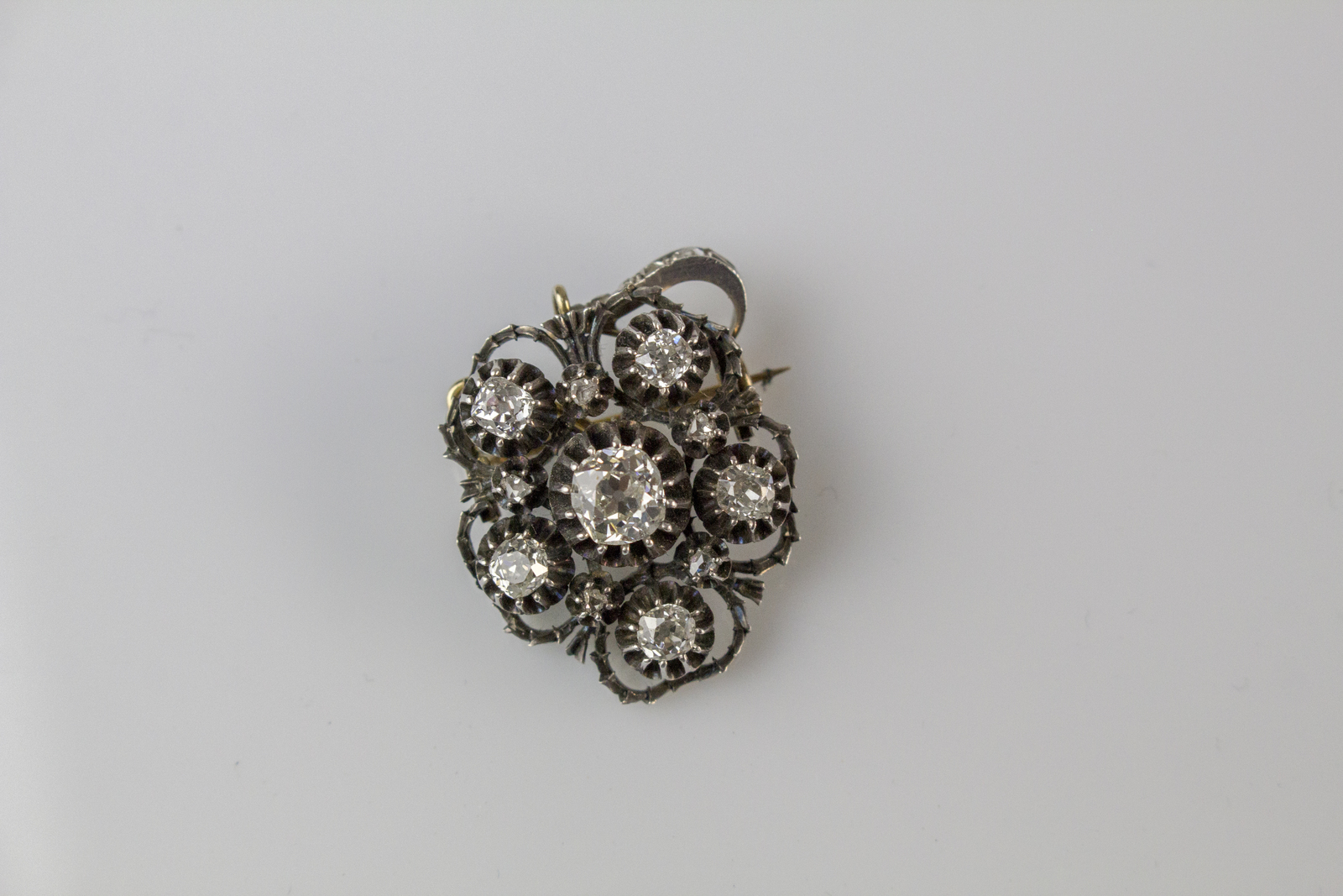 Spilla a ciondolo metà 800 in oro e argento. Diamanti tagliati a cuscino...