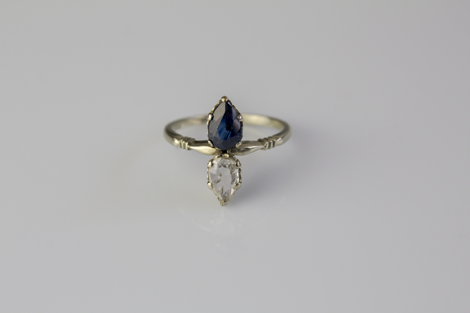 [Nessun Autore] White 18kt gold contrarié ring, gr 2.55. Pear shape diamond cts 0.32. Pear shape sapphire cts 0.40. . . .