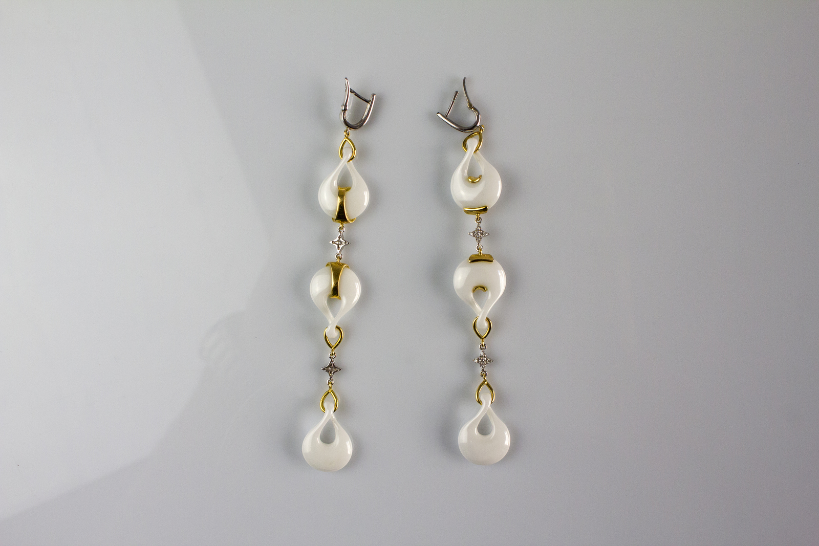 Orecchi in oro, gr 6.80. Diamanti cts 0.36 e ceramica. Firmati leaderline.