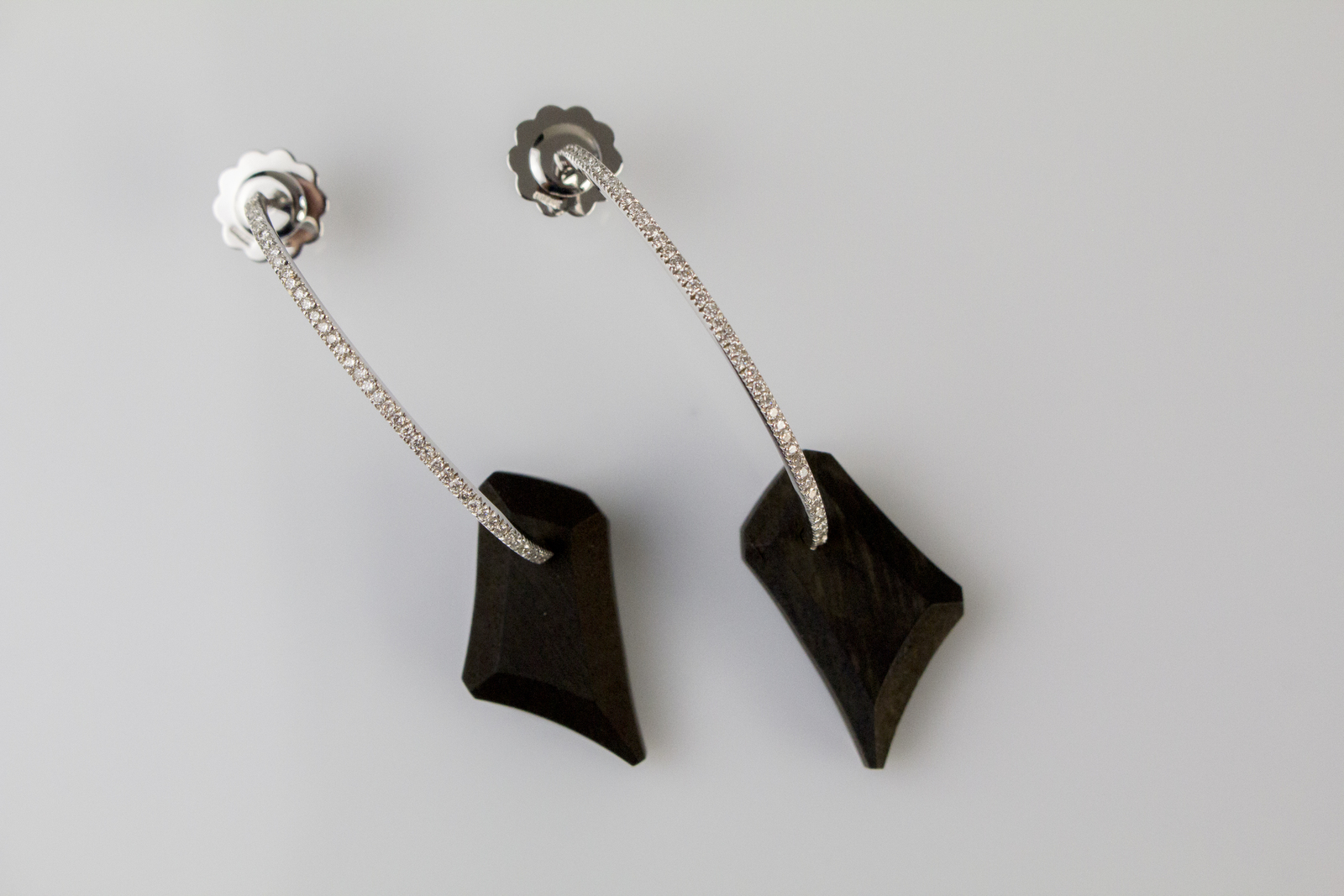 Orecchini in ebano e oro bianco, gr 5.7. Diamanti cts 0.54. Firmato leaderline. . .
