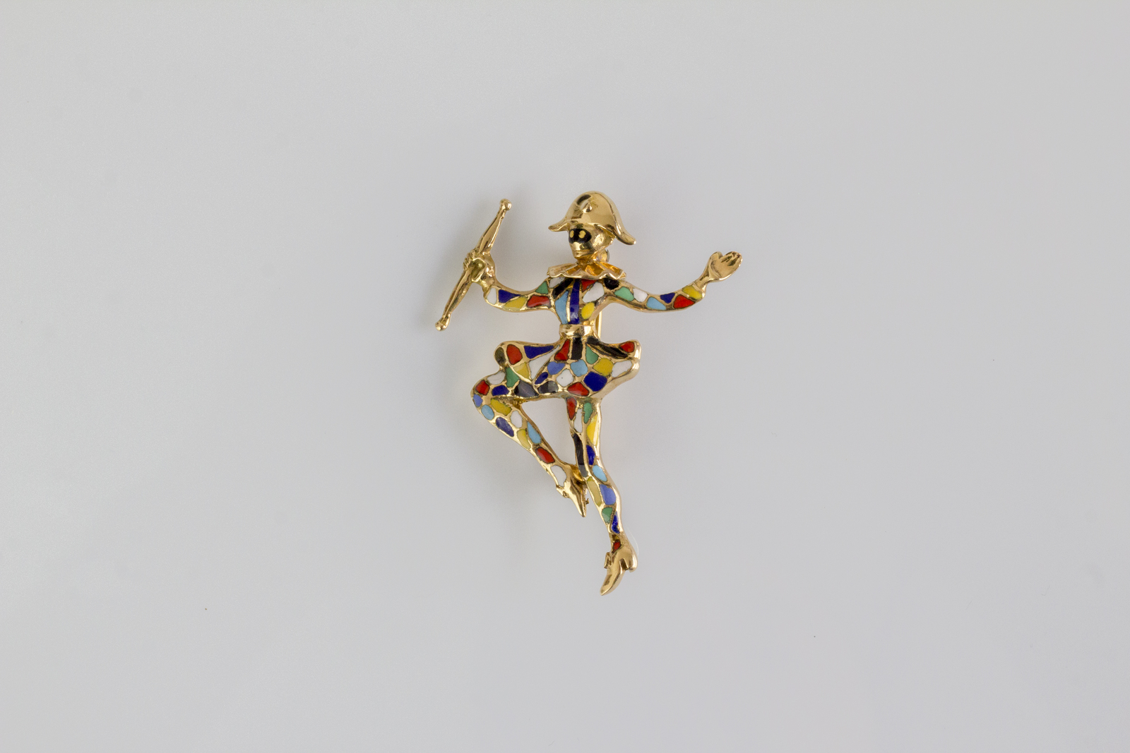 Spilla in oro giallo 18kt e smalti, Raffigurante arlecchino, gr 12. . .