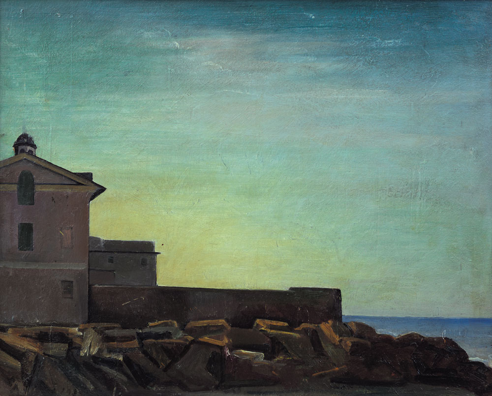 ACHILLE FUNI Ferrara 26/02/1890 - Appiano Gentile (Co) 1972 - Marina di Chiavari, 1925, olio su tavola cm. 40x50, firma e anno in basso a sinistra, timbro ed etichetta della Galleria Del Milione (MI) al retro.