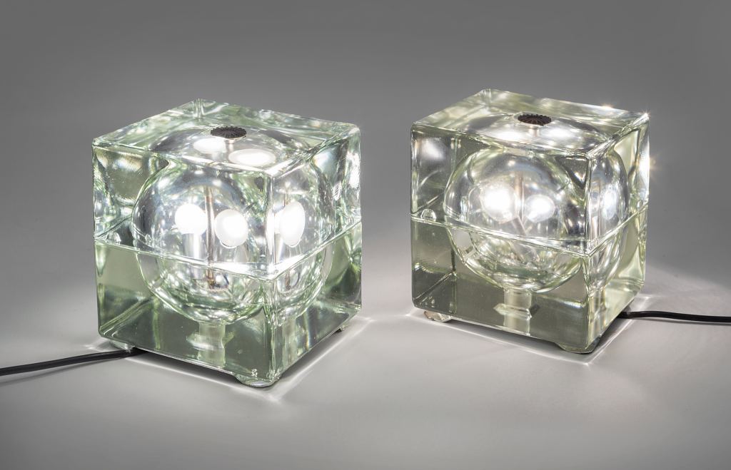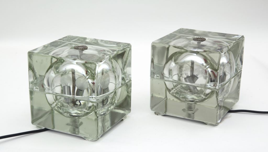 Due lampade da tavolo "Cubosfera" per FIDENZA VETRARIA, 1968.