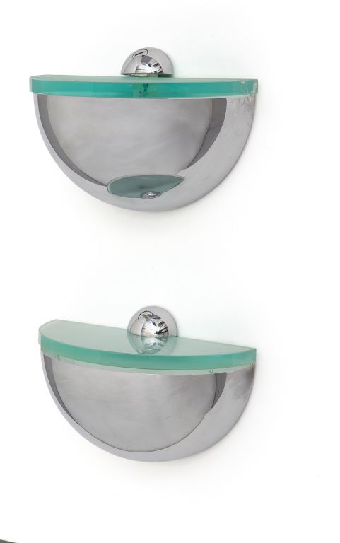 FONTANA ARTE Due lampade a parete, 1966. Ottone cromato, cristallo di forte...