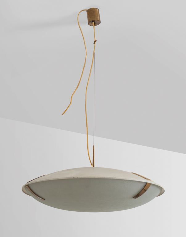 Alluminio laccato, ottone, vetro ghiacciato inciso.