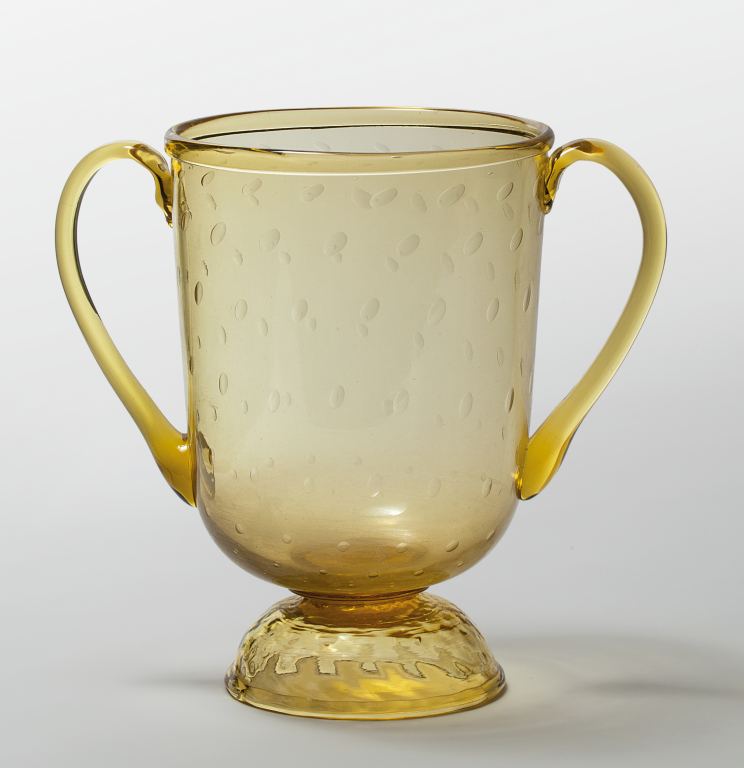 Un vaso biansato in vetro ambra con bolle disposte