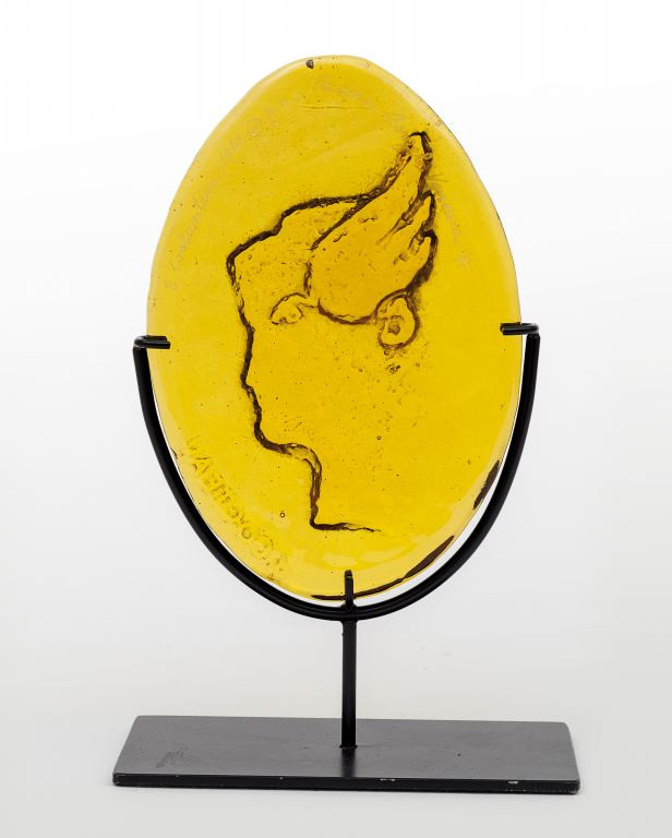 Una piastra in vetro ambra con figura di Mercurio alato, 1962.