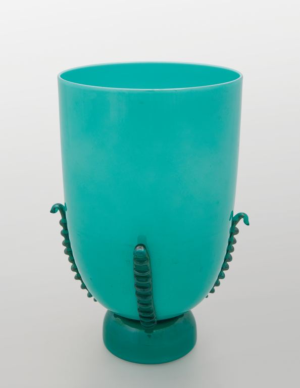 MURANO, circa 1925. Un vaso in vetro incamiciato verde con applicazioni. Tre...
