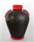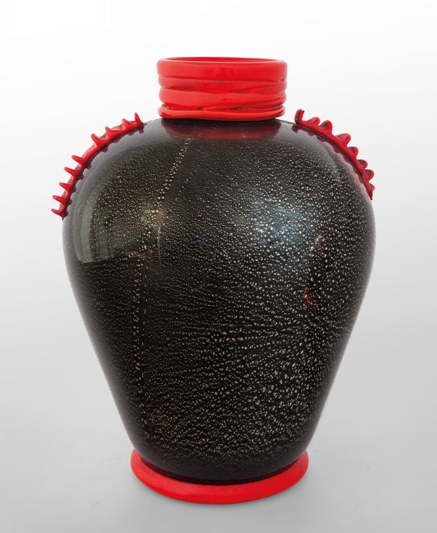 Un vaso in vetro nero con applicazione di foglia d"argento, bocca piede e prese laterali in pasta vitrea rossa.