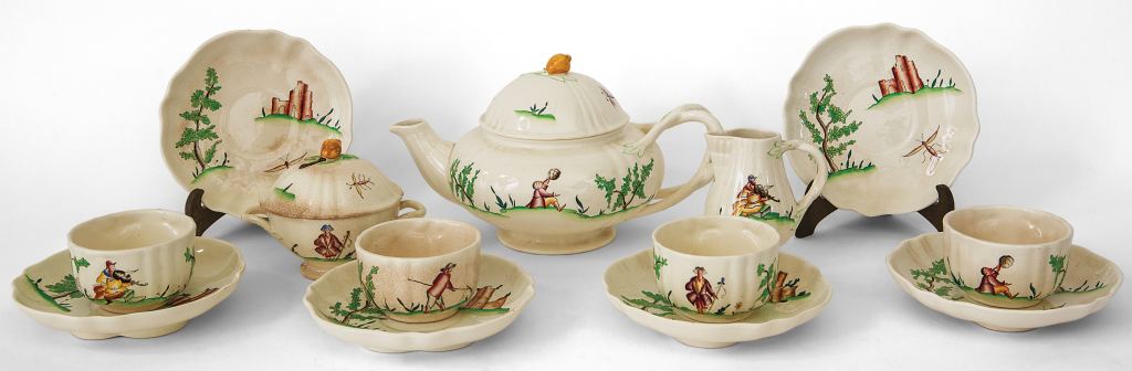 Un servizio da tè formato "vecchio Milano" con manico intrecciato per S.C.I. (Società Ceramica Italiana, Laveno), 1935, composto da teiera, zuccheriera, lattiera, 12 tazze e 12 piattini.