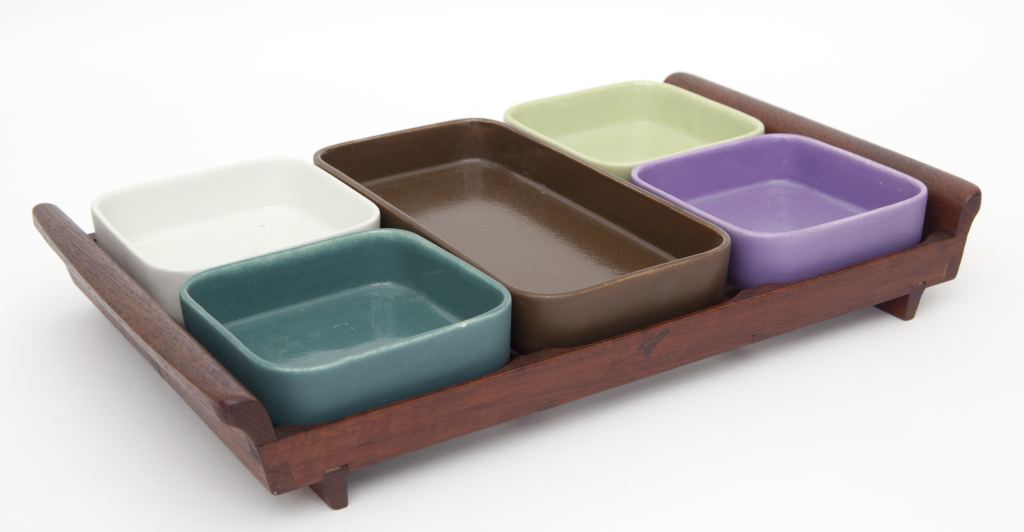 UN"ANTIPASTIERA, anni "60. Legno di teak, ceramica smaltata. Cm 39 x 24,...