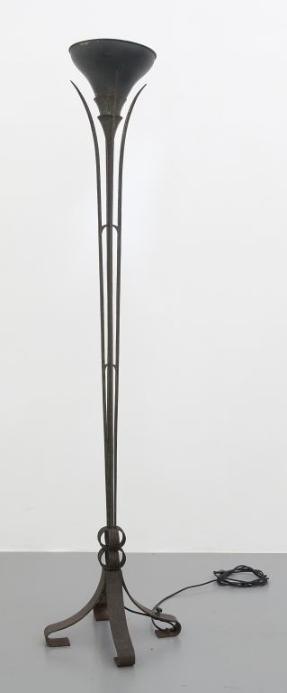 UNA LAMPADA DA TERRA, anni "30. Struttura di ferro patinato, cono diffusore...