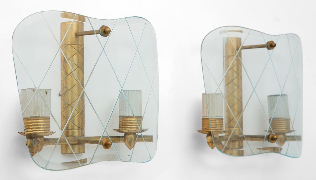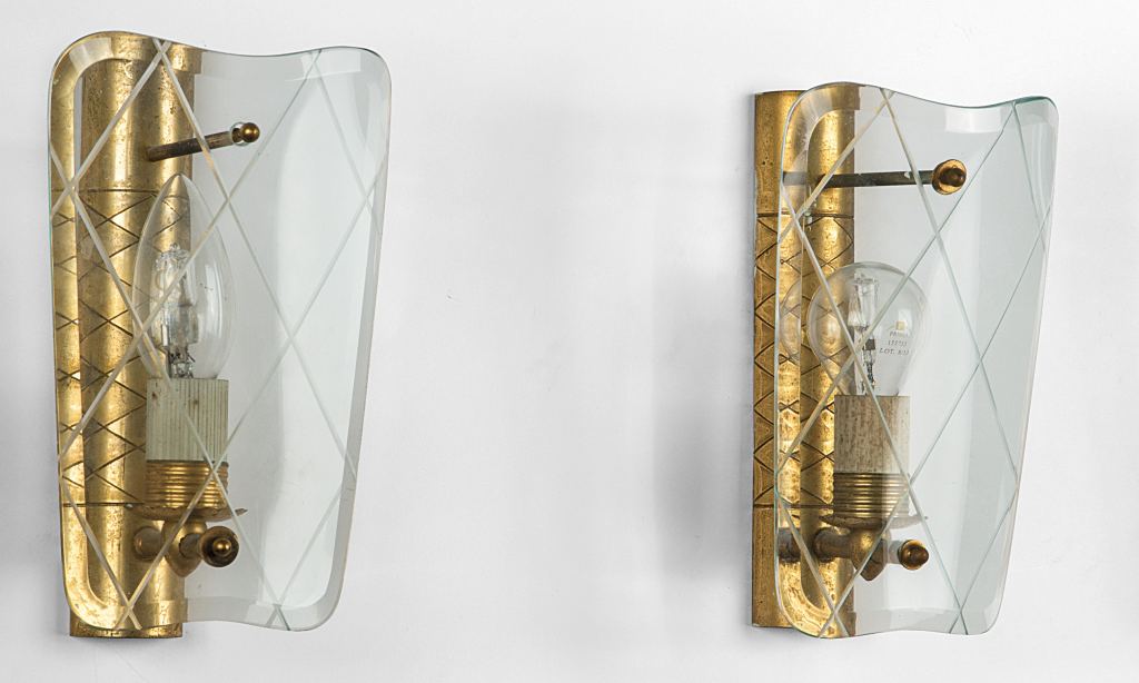 DUE LAMPADE A PARETE, anni '40. Ottone, cristallo inciso e molato. Altezza cm...