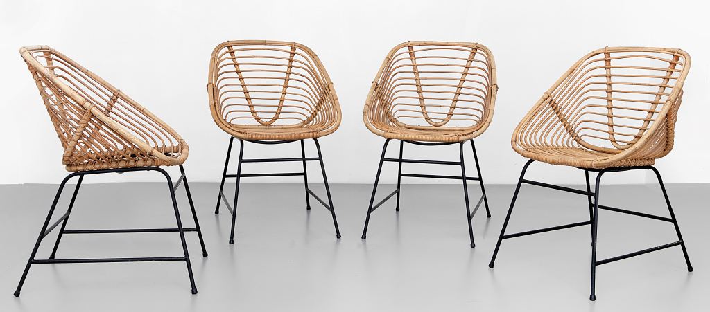 QUATTRO POLTRONCINE, anni "50. Ferro verniciato, bambù. Altezza cm 82,...