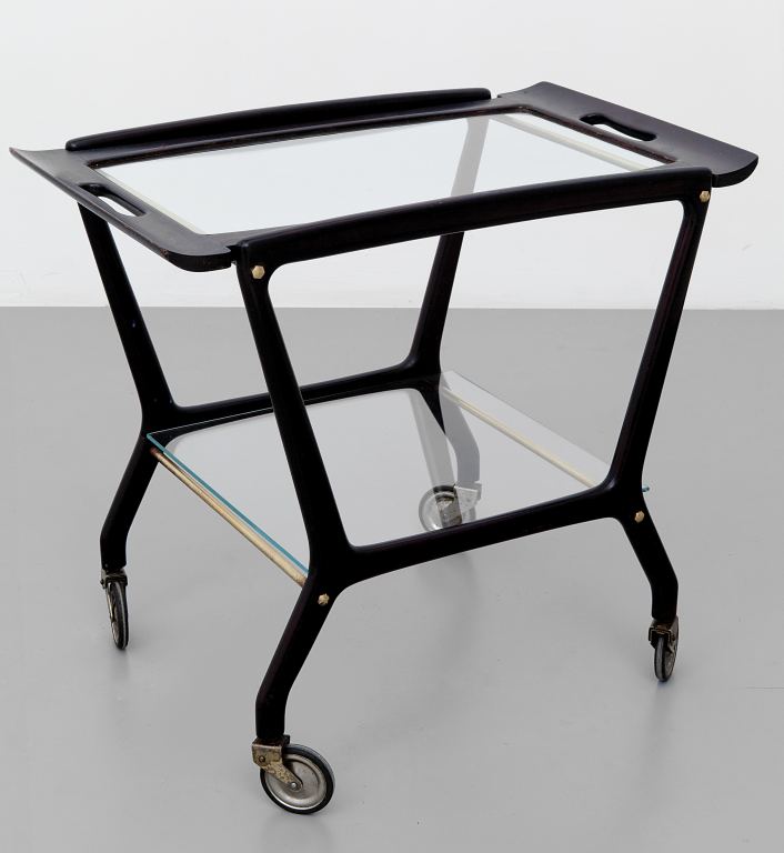 UN CARRELLO, anni "50. Legno di mogano tinto all"anilina, ottone, cristallo....