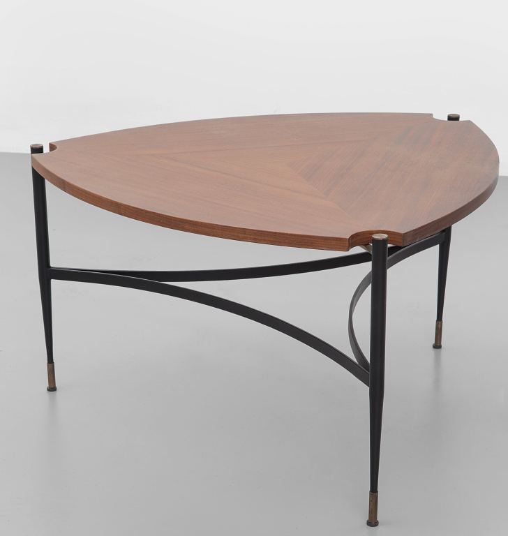 UN TAVOLINO, anni '50. Ferro verniciato, ottone, legno impiallacciato in...
