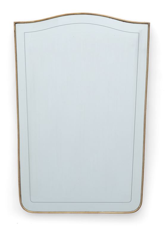 UNO SPECCHIO DA PARETE, anni '50. Ottone, cristallo argentato. Cm 82 x 52.