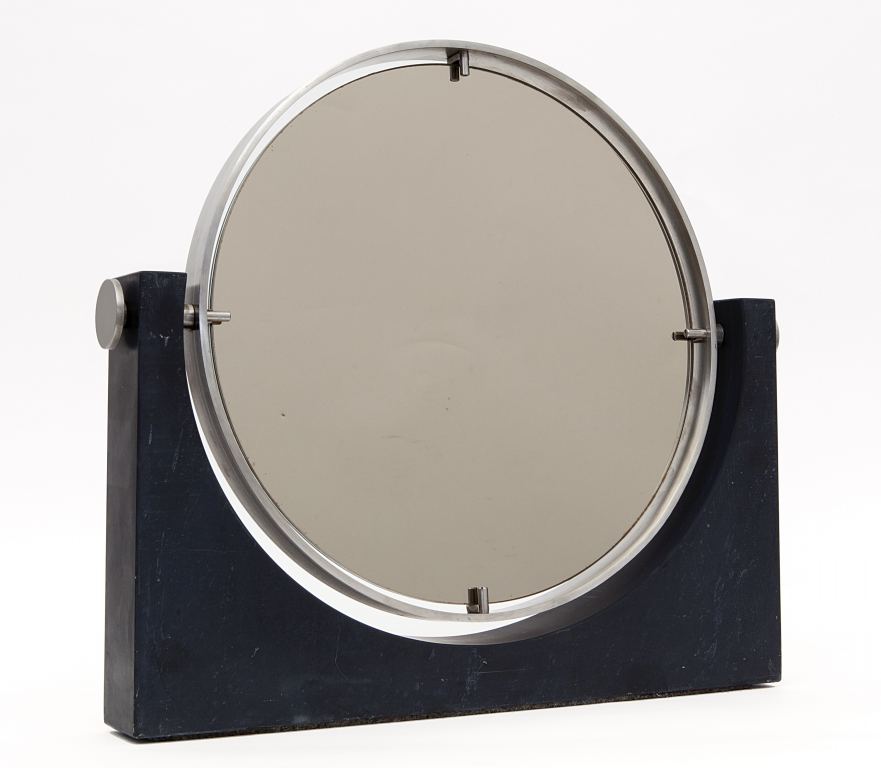 UNO SPECCHIO DA TAVOLO, anni "60. Ardesia, ottone nichelato opaco, cristallo...