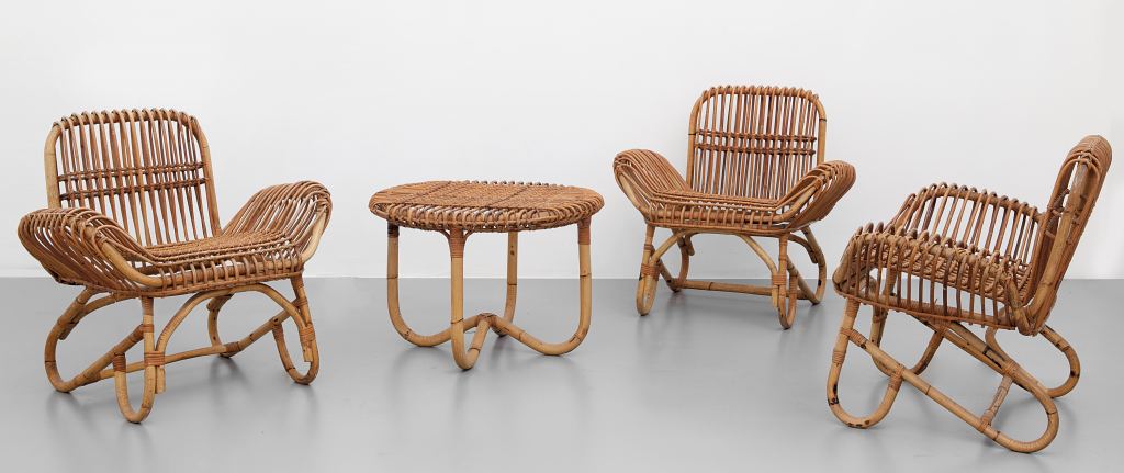 TRE POLTRONCINE E UN TAVOLINO, anni '60Malacca, bambù e canna d'India....