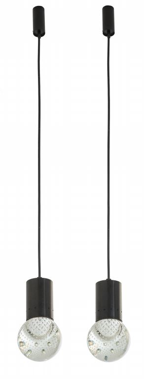 DUE LAMPADE A SOSPENSIONE, anni '60. Alluminio laccato, vetro pesante a bolle...