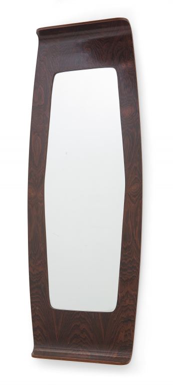 UNO SPECCHIO DA PARETE, anni '60.Compensato di mogano curvato, cristallo...