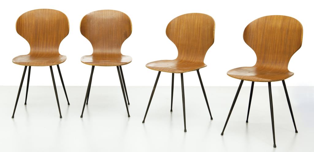 INDUSTRIA LEGNI CURVATI di CARLO RATTI Quattro sedie, anni "50. Ferro...
