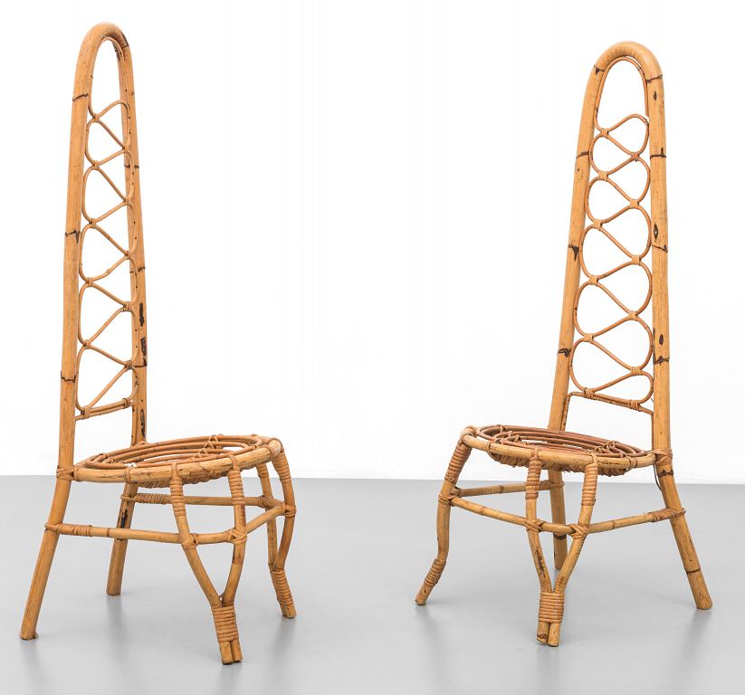 DUE SEDIE, anni '60.Malacca, bambù.Altezza cm 118, larghezza 40, profondità 45.