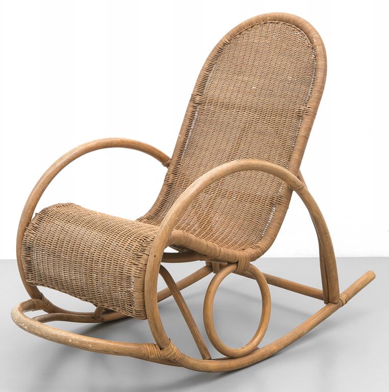 UNA POLTRONA A DONDOLO, anni '60. Malacca, midollino. Altezza cm 97,...