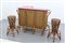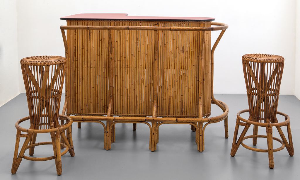 Bancone (malacca, bambù, piani interni in compensato, piano superiore rivestito in formica): cm 105 (h) x 148 x 100 sgabelli (malacca, bambù): altezza cm 78.