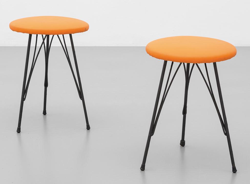 DUE SGABELLI, anni '60.Ferro verniciato, seduta imbottita rivestita in...