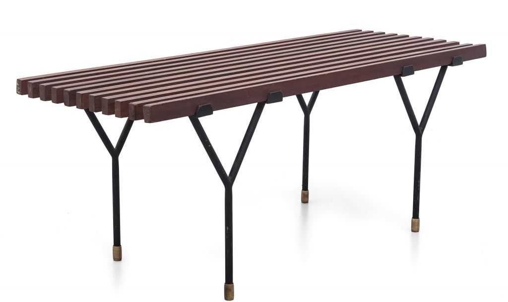 UNA PANCA, anni '60. Ferro verniciato, legno di teak tinto all'anilina. Cm 40...