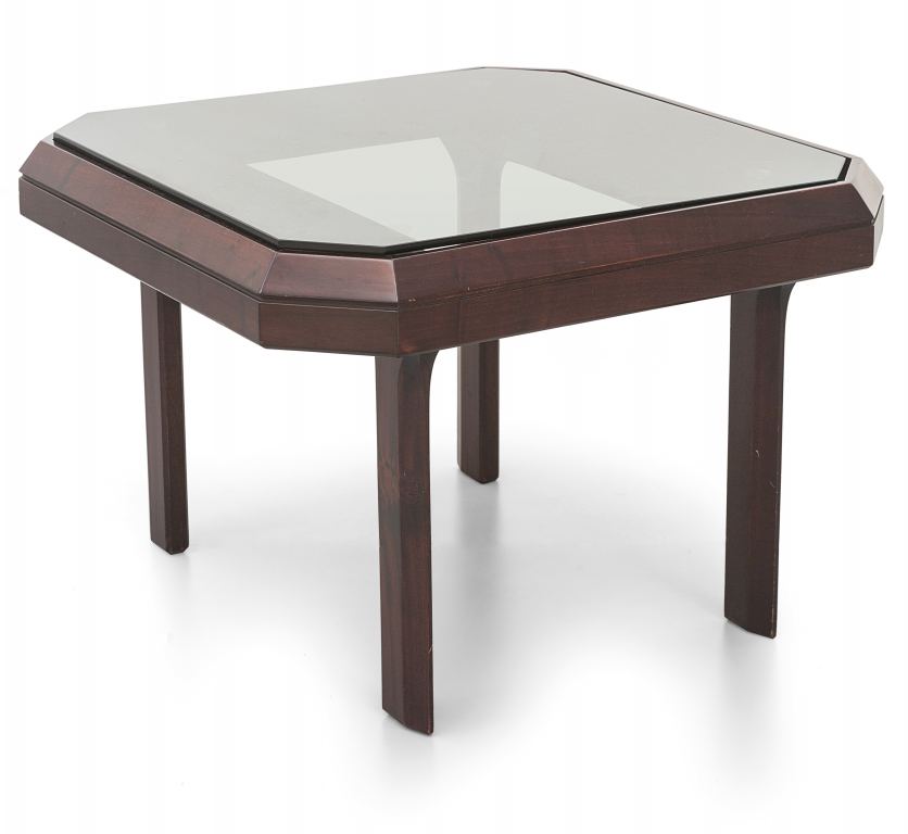 legno di mogano tinto all'anilina, cristallo grigio.