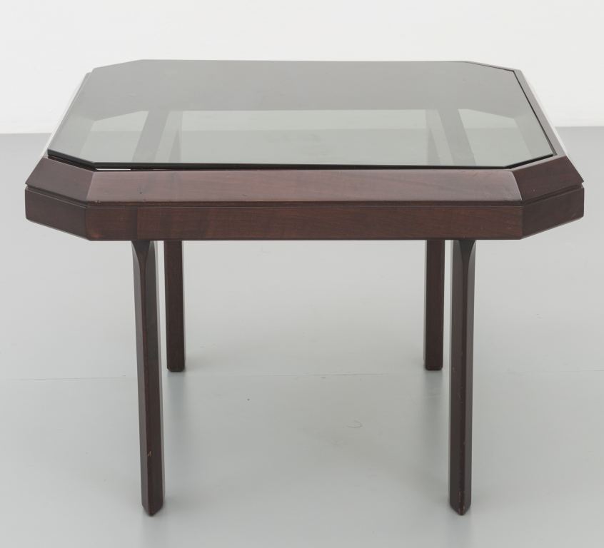 UN TAVOLINO, anni '60legno di mogano tinto all'anilina, cristallo grigio. Cm...