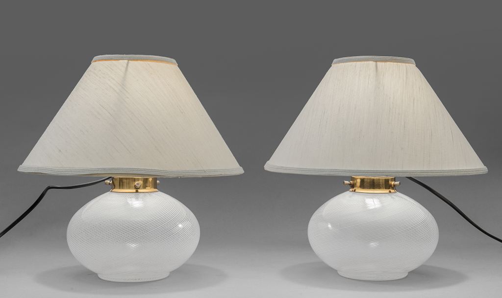 DUE LAMPADE DA TAVOLO, anni '70. Vetro a mezza filigrana soffiato, ottone,...