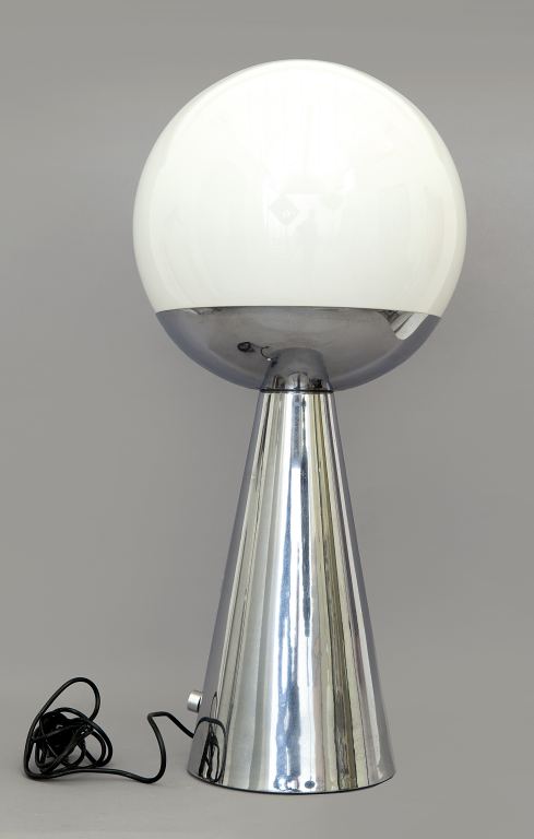 UNA LAMPADA DA TAVOLO, anni "70. Metallo cromato, vetro opalino. Altezza cm 80.