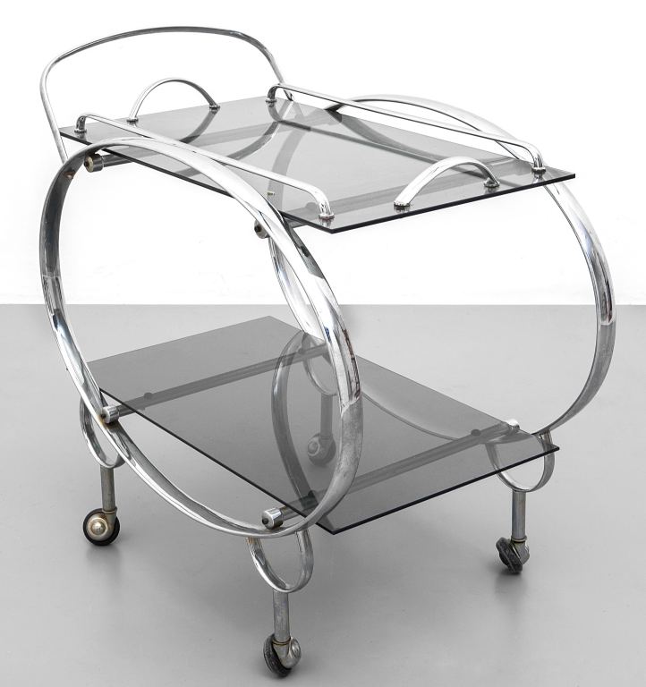 UN CARRELLO, anni "80Metallo cromato, cristallo grigio molato, vassoio...