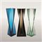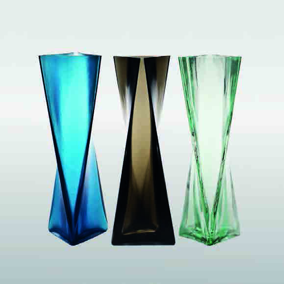 Tadao Ando “Ando” composizione di tre vasi a sezione triangolare, uno in vetro battuto a rosetta acquamarina, l’altro in vetro trasparente a fasce verdognolo, l’altro in vetro velato color talpa, 2011, altezza cm 56,5
