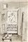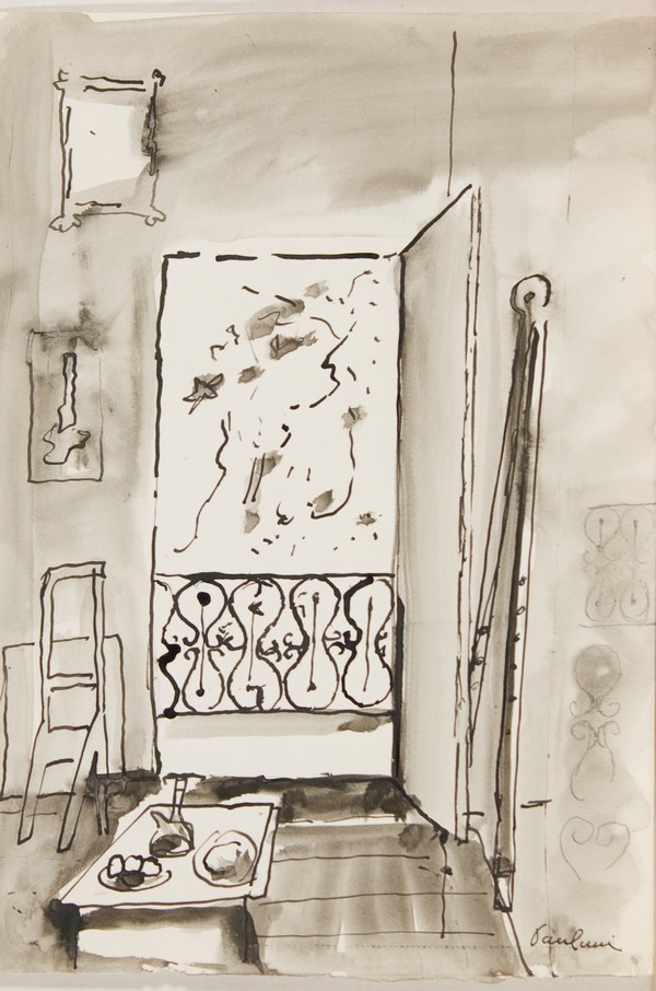 Enrico Paulucci, Interno Studio, 1950 Acquarello e china su carta, cm. 34x24 Firma in basso a destra. Autentica dell'artista su foto.