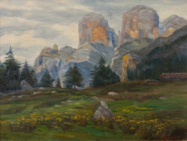 Marcelliano Canciani, Cresta del Mezzo Dì, non datata Olio su tela, cm. 53x70 Firma in basso a destra. Sergio Colussa, perito del Tribunale di Udine, ne ha confermato verbalmente l'autenticità. Sul retro timbro della Galleria degli Artisti, Udine.