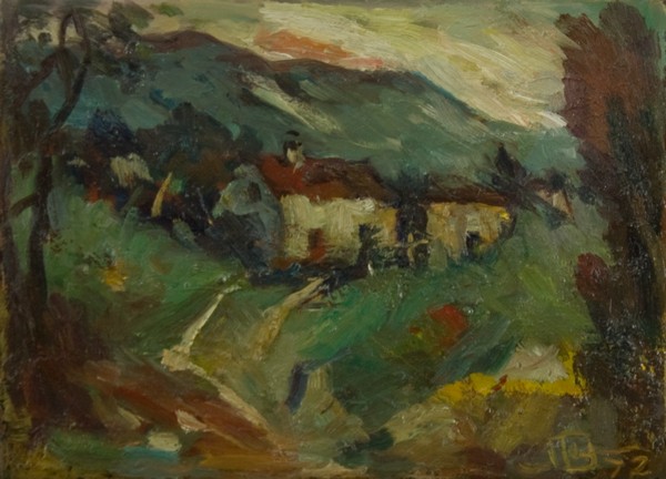 Luigi Bront, Casetta tra le colline, 1972 Olio su cartone, cm. 23x31 Firma in basso a destra.