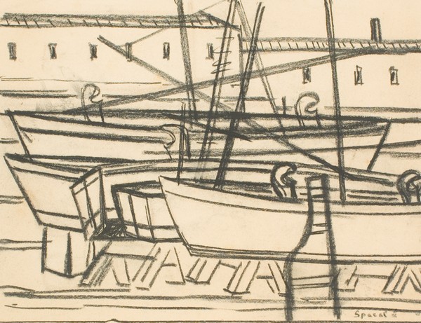 Luigi Spacal, Squero, 1950' Carboncino su carta, cm. 31x41 Firma in basso a...