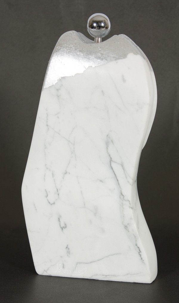 Maurizio Rossetto, Brigitte, 2016 Scultura in marmo di Carrara e foglia d'argento,pezzo unico, cm. 27x14x9 Firma sul retro. Autentica dell'artista su foto. Timbro a cura dell'artista sul fondo.