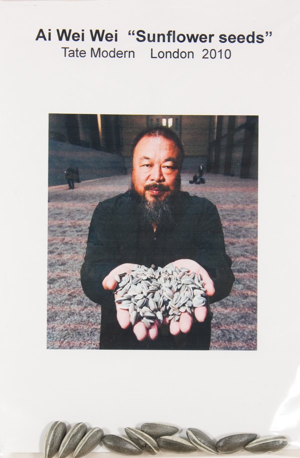 Ai Weiwei, Sunflower seed, 2010 Porcellana dipinta a mano in sacchetto di nylon con foto dell'artista, 10 pezzi cm 2x1x1 cad., cm. 23x15 Edizioni Tate Modern,London; semi cm. 2x1x1.