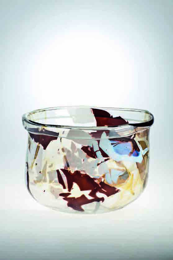 Benjamin Moore Coppa in vetro trasparente decorato con riporti in lattimo, nero e tè, orlo ripiegato, 1978 circa, cm 24x36