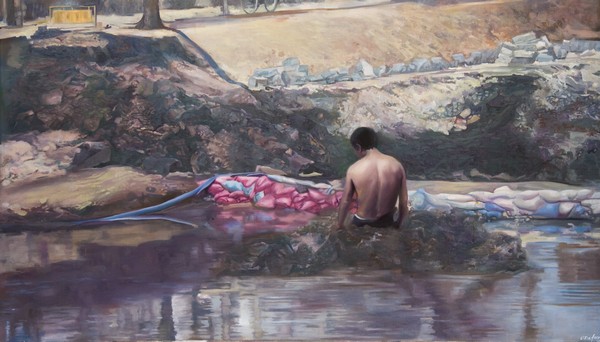 Li Dafang, River, 2005 Olio su tela, cm. 80x140 Firma in basso a destra. Sul retro etichetta della Galleria d'Arte Marella,Milano.